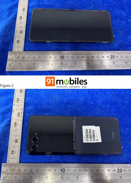 Задняя часть телефона имеет знакомый вид с горизонтальным расположением камеры. На нижней части виден брендинг Motorola Razr. Основной дисплей оснащен вырезом по центру для селфи-камеры.