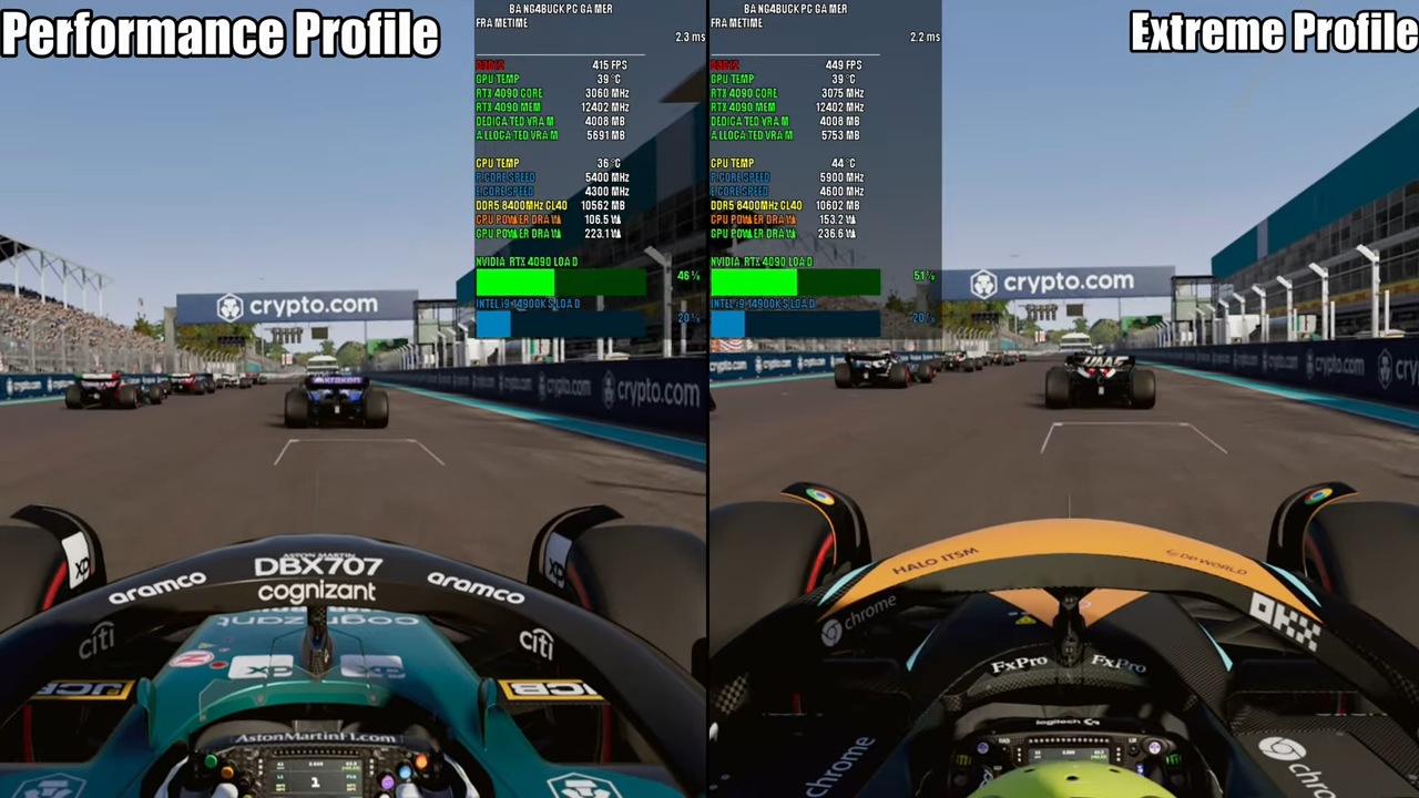 Core i9-14900KS протестировали в различных играх при ограничении ICC max на уровне 307A, что соответствует фирменному пресету Intel Performance. Так вот с указанным ограничением и в режиме такой «производительности» частота Core i9-14900KS снизилась до минимальных 5,1 ГГц, то есть уменьшилась на 17% относительно максимальной заявленной частоты 6,2 ГГц. Падение FPS в играх хорошо характеризует скриншот. Совершенно очевидно, что ограничение ICC max на уровне 249A снизит частоты (и, соответственно, производительность системы) ещё больше.