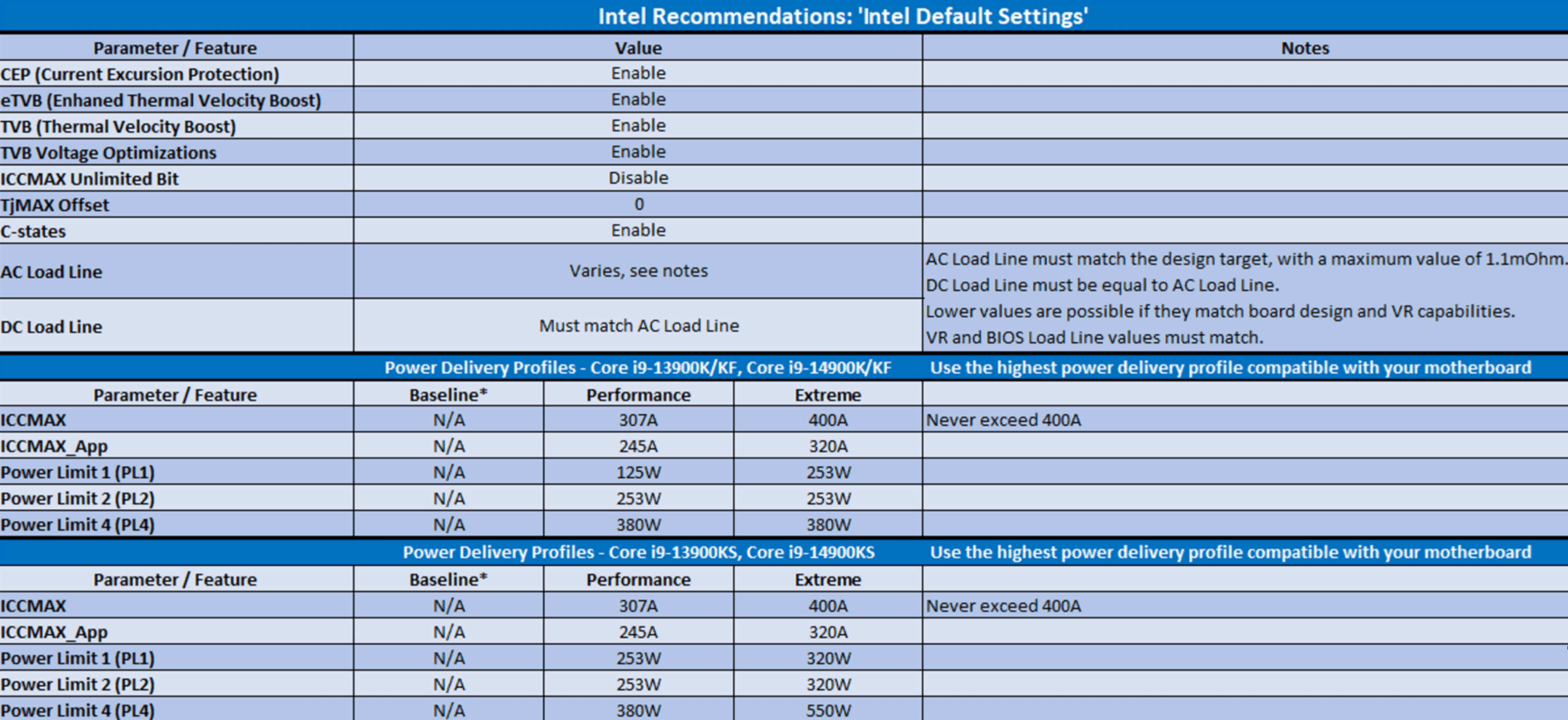 Эти настройки BIOS Intel Baseline Profile, по-видимому, основаны на руководствах по подаче питания, ранее предоставленных Intel производителям, описывающих различные варианты подачи питания для процессоров Core K 13-го и 14-го поколения в зависимости от возможностей материнской платы.