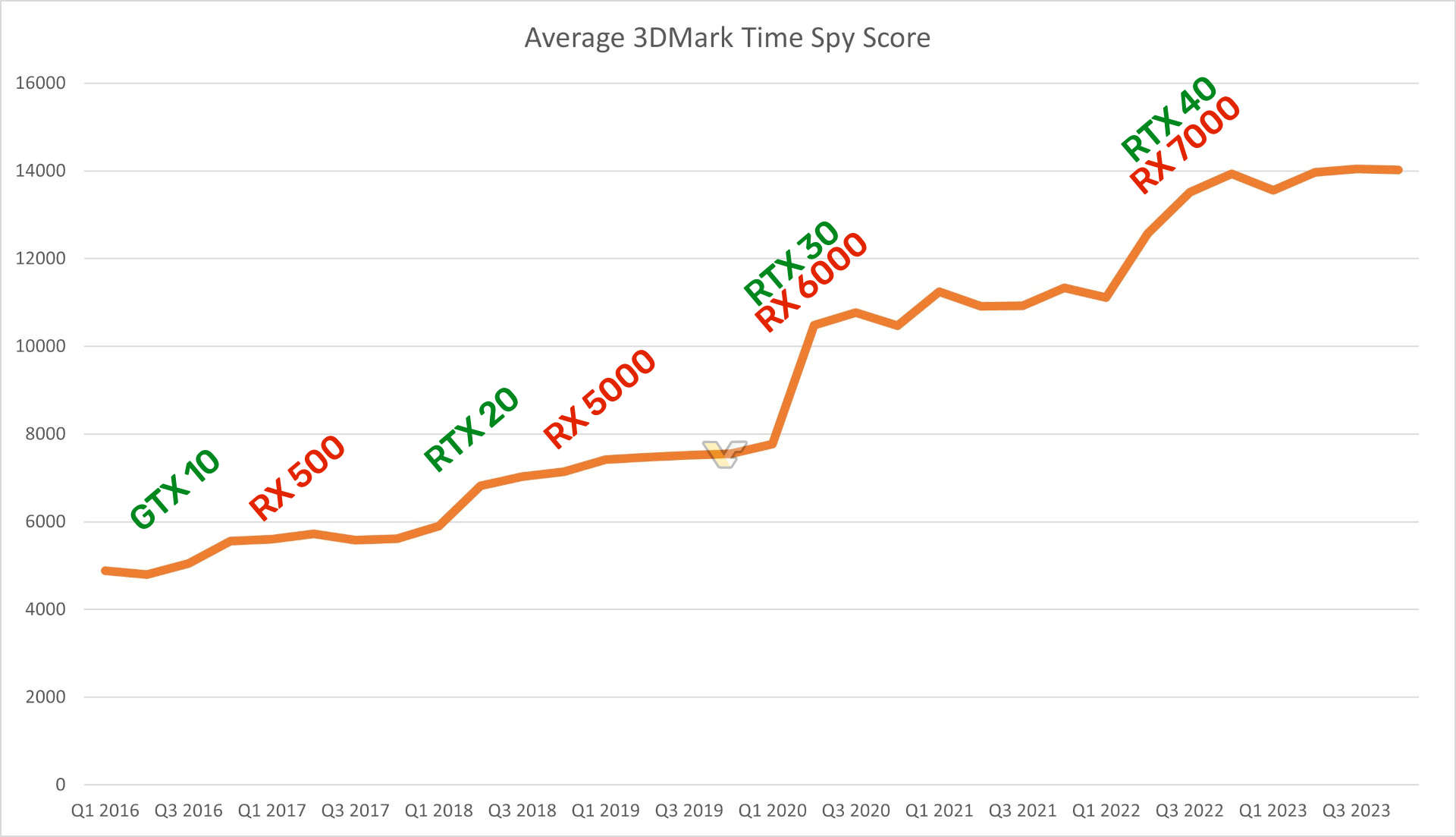 Разработчики бенчмарка 3DMark опубликовали график, отображающий рост производительности видеокарт в тесте TimeSpy за последние восемь лет.