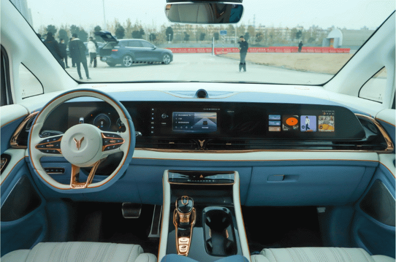 В кабине расположен тройной экран, состоящий из 12,3-дюймовой ЖК-приборной панели, 12,3-дюймового центрального экрана управления и 12,3-дюймового развлекательного экрана переднего пассажира. Все это работает на базе Qualcomm Snapdragon 8155 и поддерживает HiCar от Huawei.