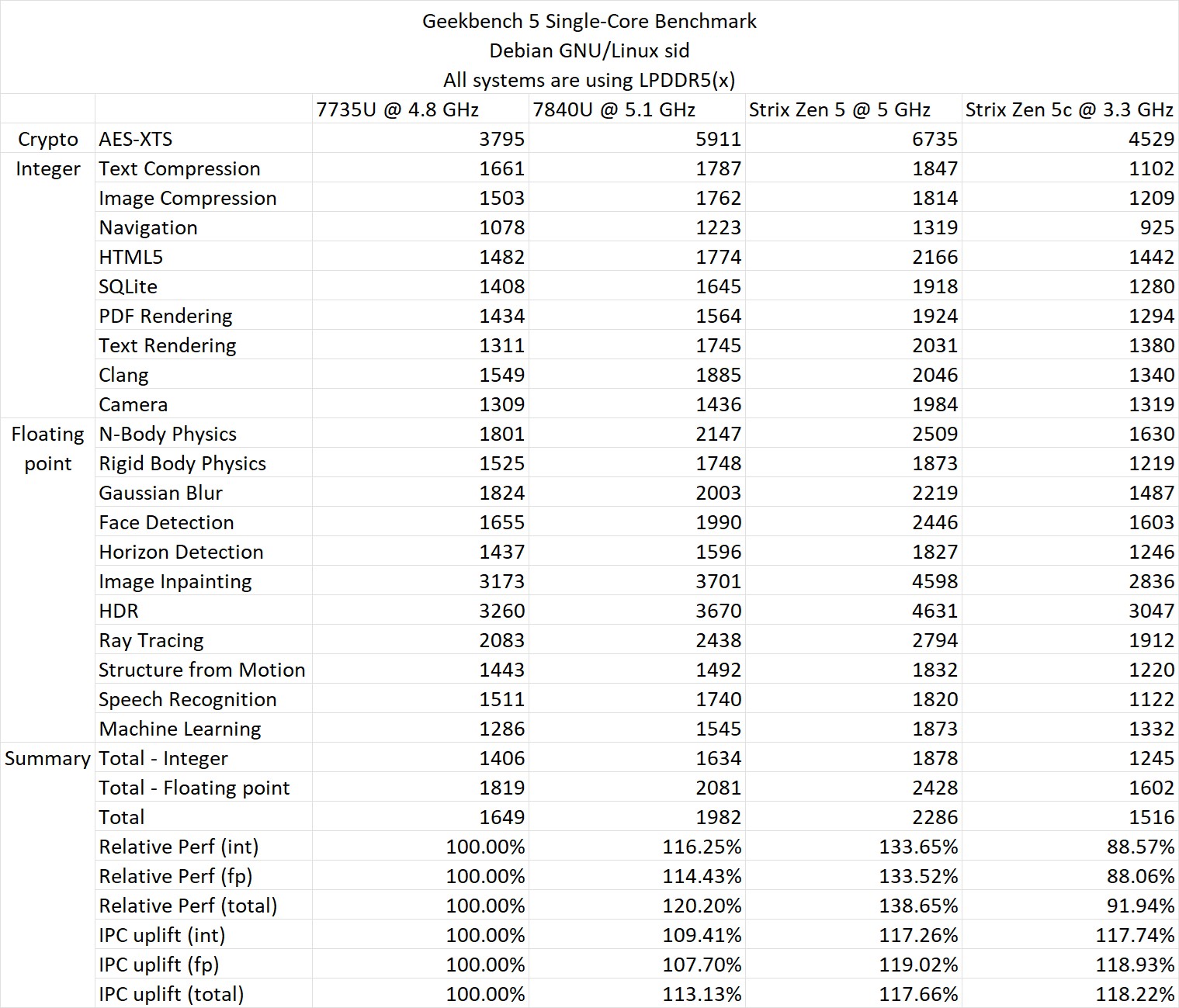 В тестах участвовал некий ноутбук на основе Ryzen AI 9 365, то есть младший из двух APU. У него 10 ядер CPU вместо 12 у старшей модели и 768 потоковых процессоров iGPU против 1024. В данном случае тесты касаются только процессорной части. Из 10 ядер CPU у новинки четыре — это ядра Zen 5, а остальные шесть — Zen 5c. При этом первые в тесте работали на частоте 4,8 ГГц, а вторые имели частоту 3,3 ГГц. Хотя по параметрам на сайте AMD большие должны работать на частоте до 5 ГГц. Но частота была ограничена, чтобы выровнять всех участников тестирования, ведь кроме новинки были взяты Ryzen 7 7840U на Zen 4 и Ryzen 7 7735U на Zen 3+. Также стоит отметить, что неясно, был ли на тестах серийный продукт или какой-то более ранний.