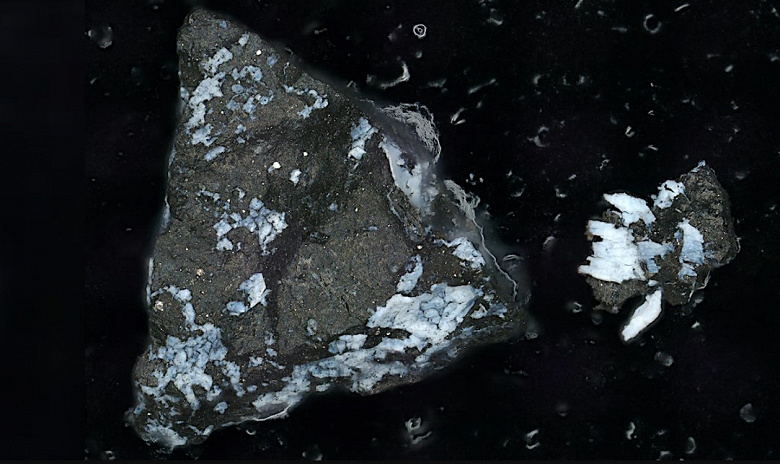 Фрагменты образца астероида Бенну длиной около миллиметра с коркой фосфата. Источник: Lauretta & Connolly et al. (2024) Meteoritics & Planetary Science, doi:10.1111/maps.14227 Образец также содержит фосфат магния-натрия, что стало неожиданностью для исследовательской группы, поскольку его не было обнаружено в данных дистанционного зондирования. Его присутствие в образце намекает на то, что астероид мог отколоться от давно исчезнувшего небольшого древнего космического тела.