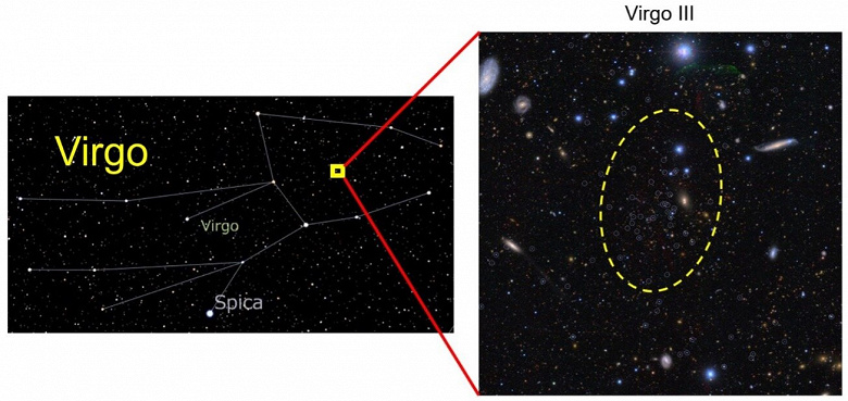 Положение недавно обнаруженной карликовой галактики (Дева III) в созвездии Девы (слева) и её (справа; обведены белым). Звёзды галактики сосредоточены внутри пунктирной линии на правом изображении. Источник: NAOJ / Tohoku University Теперь команда обнаружила ещё две карликовые галактики Дева III (Virgo III) и Секстант II (Sextans II). С учётом этого открытия общее количество галактик-спутников, обнаруженных различными исследовательскими группами, составляет девять. Однако это число всё ещё значительно ниже, чем 220 галактик-спутников, предсказываемых стандартной теорией тёмной материи.