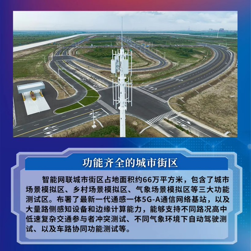 Интеллектуальный сетевой городской квартал занимает площадь около 660 000 квадратных метров и включает три зоны функциональных испытаний: зону моделирования городской сцены, зону моделирования сельской сцены и зону моделирования погоды.