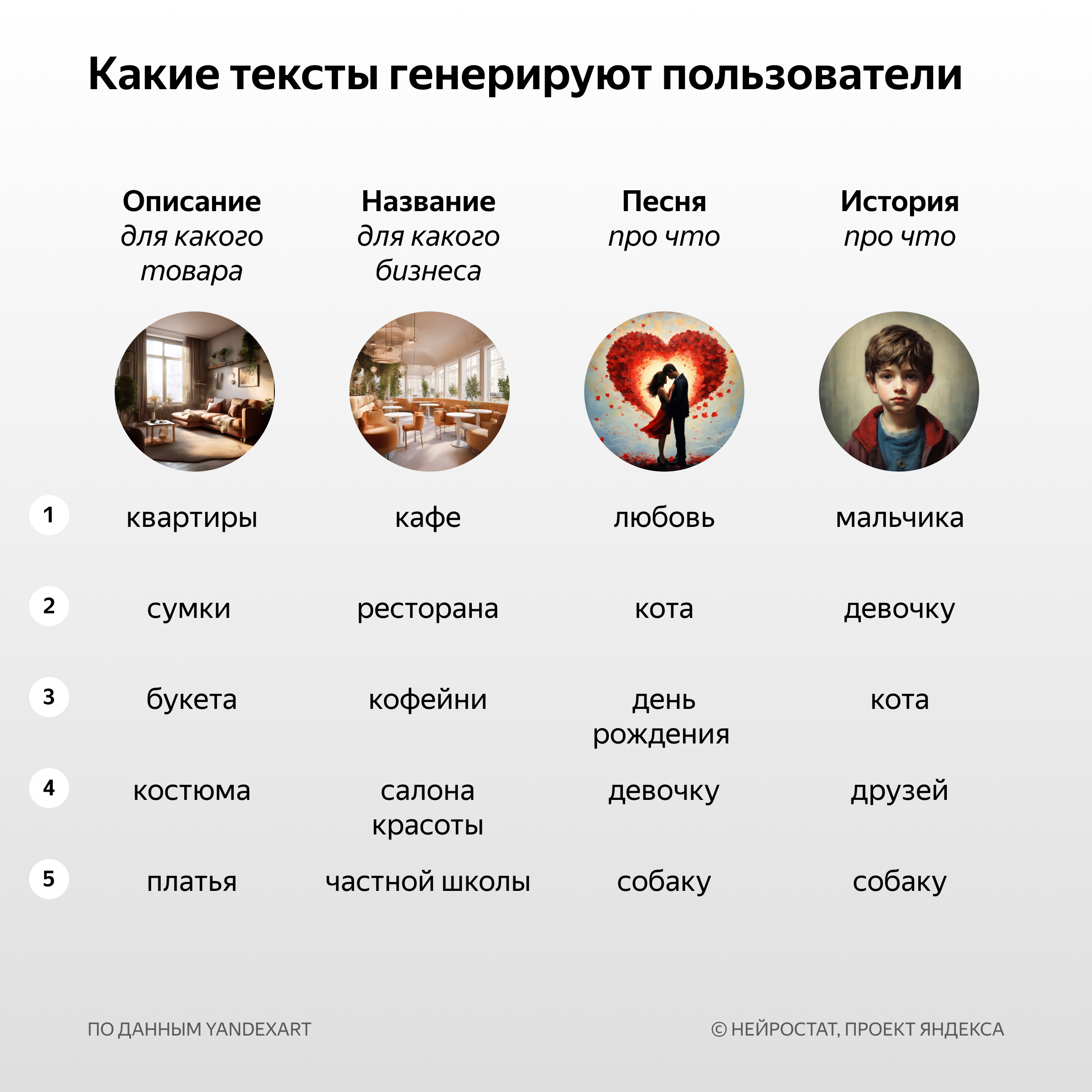 Иллюстрация: Яндекс YandexGPT используют и для решения рабочих задач. Например, она помогает продавать товары — пользователи обращаются к нейросети, чтобы подготовить их описание. Самые популярные объекты и вещи, для которых хотят составить описание, — квартиры, платья и букеты. Также пользователи применяют возможности YandexGPT для генерации названий брендов и рекламных объявлений. Придумать название чаще всего просят для кафе, ресторанов, кофеен, строительных компаний и салонов красоты.