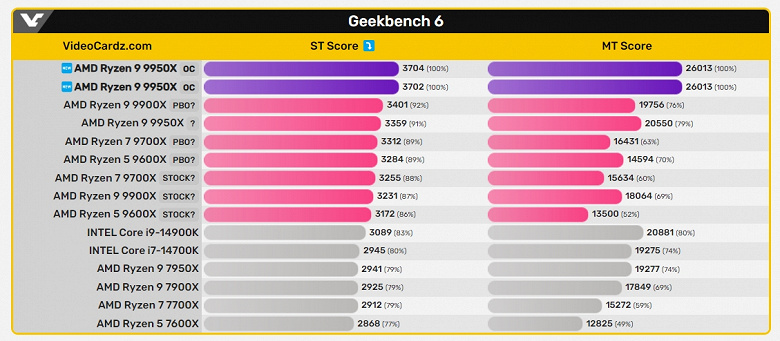 В базе Geekbench есть пара записей для частоты 5953 и 5950 МГц с результатами около 3700 баллов в однопоточном режиме и 26 000 баллов в многопоточном.