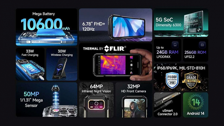 Аппарат предлагает 6,78-дюймовый IPS-дисплей Full HD+ с частотой 120 Гц и гигантский аккумулятор емкостью 10 600 мА·ч с зарядкой мощностью 33 Вт и беспроводной зарядкой мощностью 30 Вт. Из особенностей защиты можно выделить IP68/69K и MIL-STD-810H. Цены пока нет.