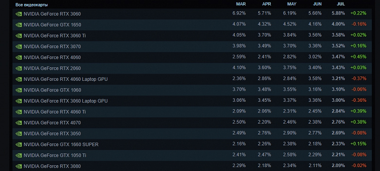 фото: Nvidia Лидирует по итогам июля всё ещё RTX 3060, которую, к слову, Nvidia снимает с продажи. Карта занимает 5,88% и до сих пор показывает рост.