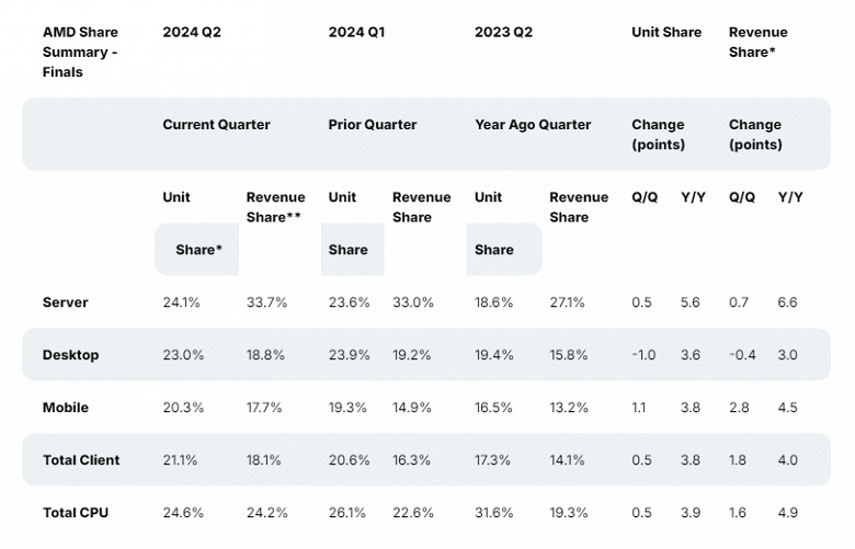 Сильнее всего AMD продолжает расти в серверном сегменте, занимая уже 24,1% против 18,6% годом ранее. А в денежном выражении компания контролирует уже 33,7% против 27,1% год назад.