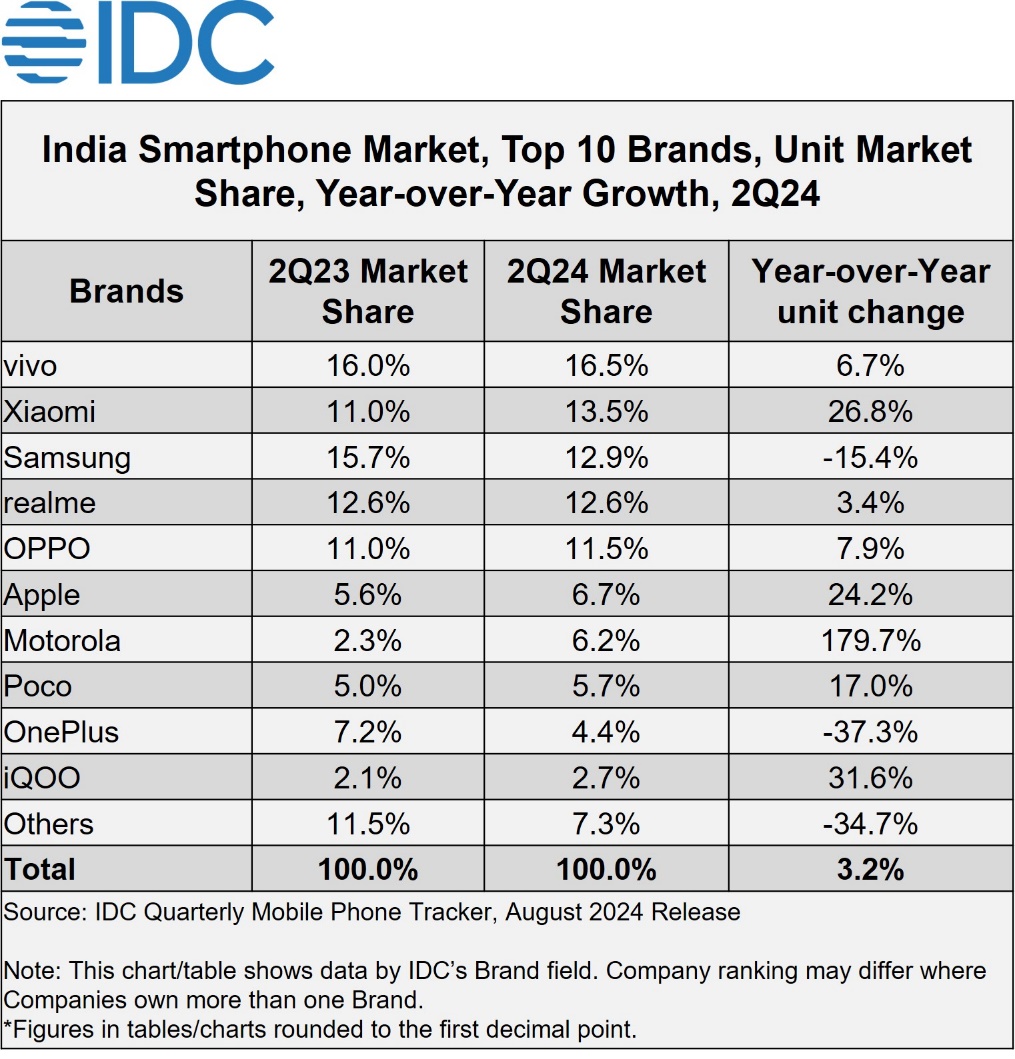 Samsung опустилась на третье место и рискует упасть на пятое, а Motorola выросла более чем вдвое. Статистика рынка Индии показывает интересные изменения