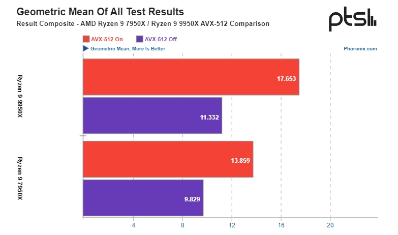 фото: Phoronix Во-вторых, поддержка AVX-512 в новом поколении реализована ещё лучше, чем в старом, обеспечивая прирост на 56% против 41%, благодаря чему в итоге Ryzen 9 9950X опережает предшественника уже на 27%!