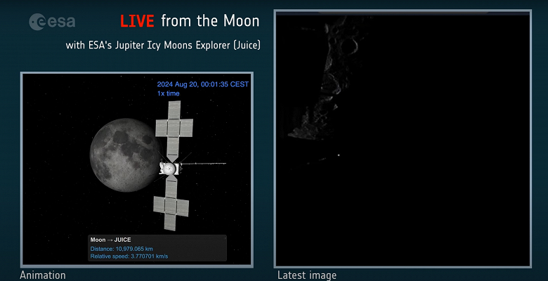 Космический аппарат Jupiter Icy Moons Explorer (JUICE) Европейского космического агентства (ESA) 19 августа 2024 года в 23:15 по центральноевропейскому летнему времени (20 августа в 00:15 по московскому времени) прошёл всего в 750 км от поверхности Луны. JUICE сделал несколько фотографий в память об этой исторической встрече.
