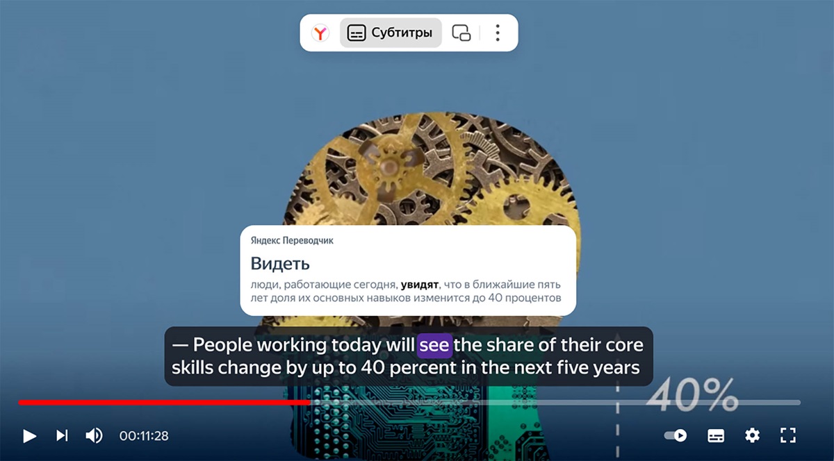 Браузер генерирует субтитры для любых видео и онлайн-трансляций. Если в видео звучит речь на разных языках, браузер это учтёт: для реплик на русском языке он сгенерирует субтитры на русском, для англоязычных — на английском. Если в субтитрах встретится незнакомое слово или фраза, «Яндекс Браузер» поможет перевести их на русский язык — для этого достаточно навести на них курсор. В будущем появятся субтитры для песен и речи, звучащей на фоне музыки, сообщили в Яндексе.