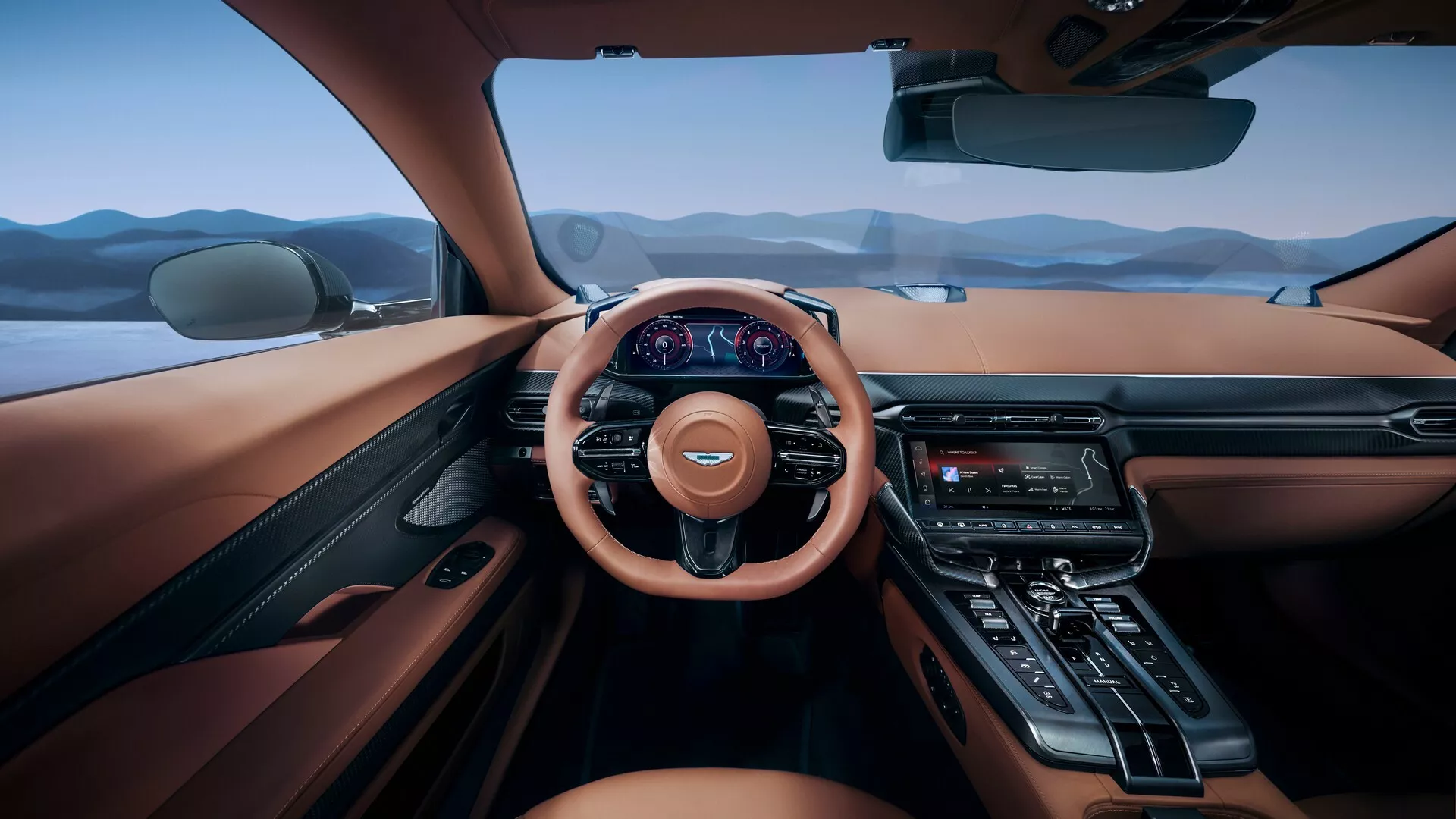 Фото: Aston Martin В салоне установлены 10,25-дюймовая цифровая приборная панель и 10,25-дюймовая информационно-развлекательная система, 16-позиционные электроприводные передние сиденья, обивка из алькантары и полуанилиновой кожи. Модель также оснащена аудиосистемой Bowers & Wilkins с 15 динамиками и опциональной деревянной отделкой.