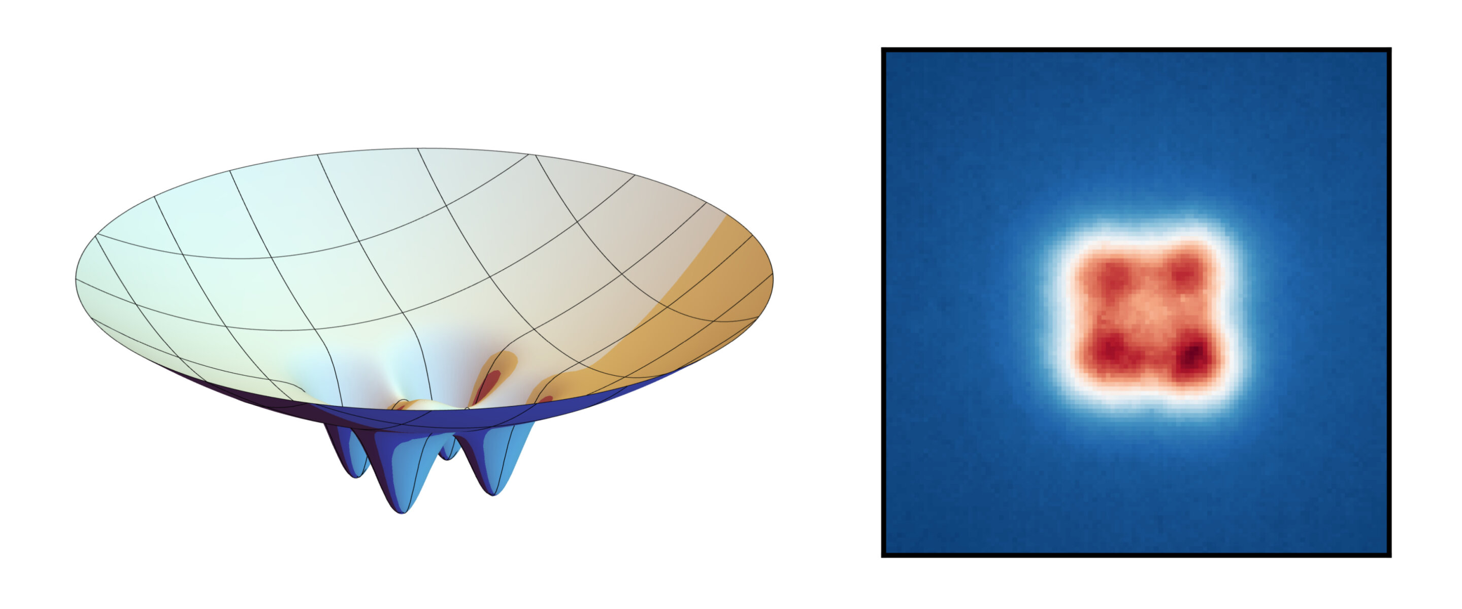 Создав углубления на отражающих поверхностях (показаны слева в преувеличенном виде; отражающая поверхность обращена вверх), исследователи смогли отпечатать структуру на фотонном конденсате (справа). Источник: IAP / University of Bonn Исследователи намеренно добавили небольшие углубления на отражающие поверхности, что позволило создать четыре области, где конденсат «предпочитает» оставаться. Это свойство можно использовать для создания квантовой запутанности, когда изменение состояния света в одной области влияет на свет в других областях.