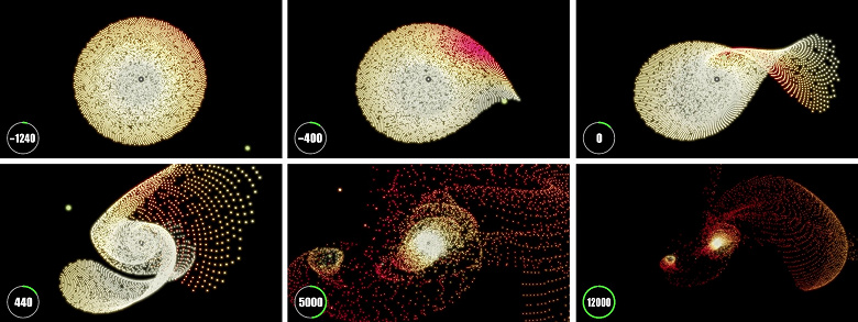 Результаты симуляции A1. Источник: Nature Astronomy (2024). DOI: 10.1038/s41550-024-02349-x «Мы обнаружили, что пролёт звезды миллиарды лет назад может дать естественное объяснение наблюдаемым распределениям. Некоторые из этих объектов могли быть захвачены гигантскими планетами в качестве лун, что объяснило бы, почему внешние планеты нашей Солнечной системы имеют два разных типа спутников», — объяснил Сюзанна Пфальцнер, астрофизик из Исследовательского центра Юлиха.