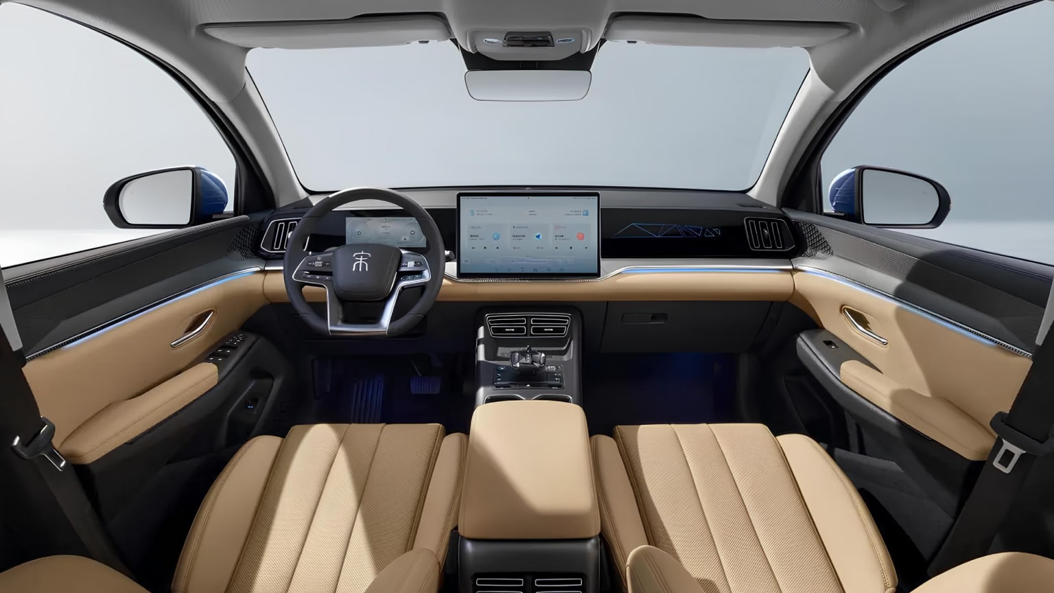 Фото BYD Второй ряд нового Song Pro DM-i получил центральный подголовник и подлокотник. Сзади расположены вентиляционные отверстия и порты зарядки. Новый кроссовер получил большую панорамную крышу, визуально расширяющую пространство в салоне. Интерьер выполнен в черно-бежевой цветовой гамме.
