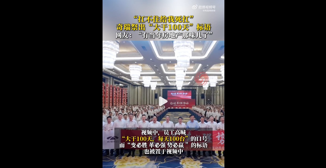 Изображение Fastflux Кроме того, ролик с того же мероприятия, опубликованный на страничке Южно-Китайского маркетингового центра Chery Fengyun, включает момент, когда сотрудники скандируют лозунг: «Работайте усердно 100 дней, стройте 100 машин каждый день». В ролике также виден лозунг «Перемены победят, перемены приведут к силе, а сила победит».