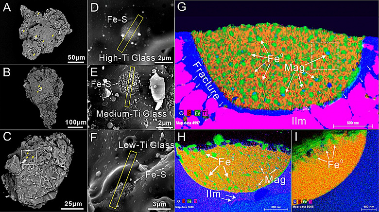 Зёрна сульфида железа в стекле образцом «Чанъэ-5» с различным содержанием Ti. Источник: IGCAS Исследование Ли и Као показало, что большое количество субмикроскопических частиц магнетита существовало в каплевидных, округлых зёрнах сульфида железа в ударных стёклах. Микроанализ показал, что этот тип магнетита вызван ударным событием. Для объяснения его образования исследователи использовали механизм эвтектоидной реакции (4FeO = Fe3O4 + Fe). Эвтектоидная реакция характеризуется тем, что она происходит при определённых условиях, таких как высокая температура, давление и концентрация реагентов. В этом случае, ударное событие на Луне создало условия, необходимые для протекания этой реакции, что привело к образованию магнетита.
