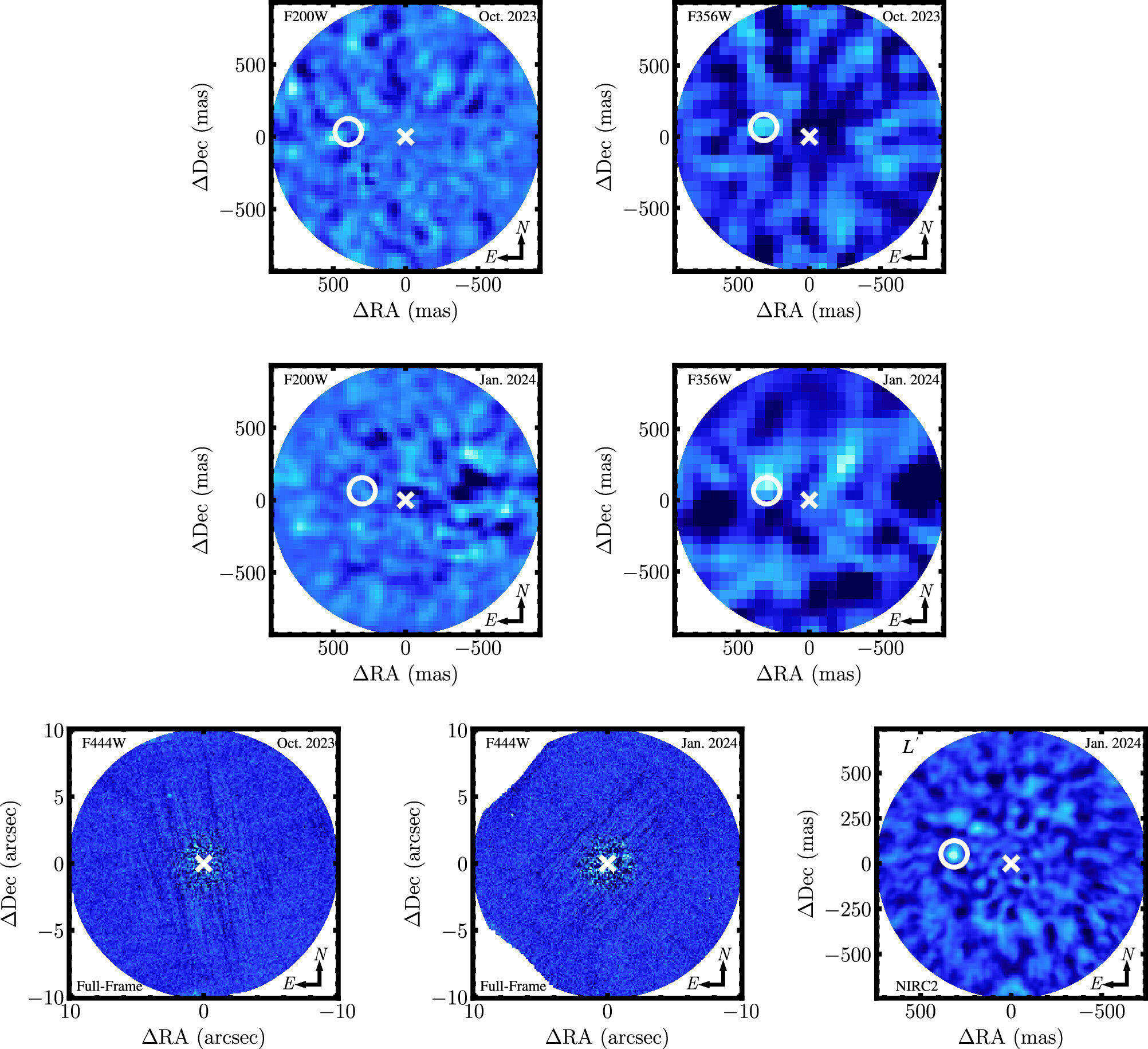 Вверху изображения F200W (слева) и F356W (справа) AF Lep. AF Lep b не восстанавливается надёжно. Внизу левое и среднее изображения показывают полнокадровое изображение F444W AF Lep. Правое изображение показывает новое изображение Keck / NIRC2 L′ AF Lep b. Белой окружностью выделено ожидаемое положение планеты. Источник: The Astrophysical Journal Letters (2024). DOI: 10.3847/2041-8213/ad736a «Принято считать, что JWST более чувствителен к планетам с меньшей массой на широких орбитах, чем наземные установки, но до его запуска не было ясно, будет ли он конкурентоспособен на малых расстояниях. Мы действительно доводим приборы до предела», — сказал Брендан Боулер, астроном из Техасского университета и соавтор исследования.