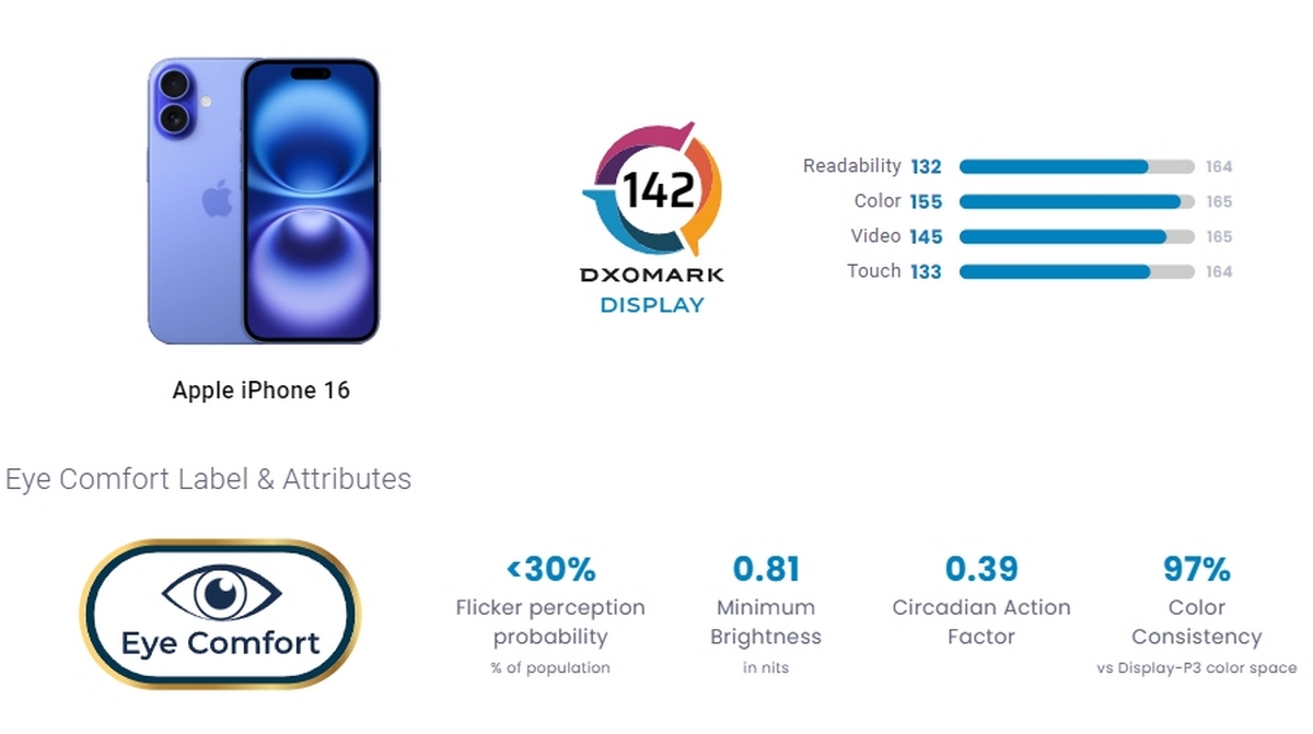 фото: DxOMark Они протестировали новинку Apple и оценили её дисплей на 142 балла. У Galaxy S24 FE оценка 145 баллов. Что интересно, даже у недорогого Galaxy A35 5G на один балл больше, чем у новинки Apple.
