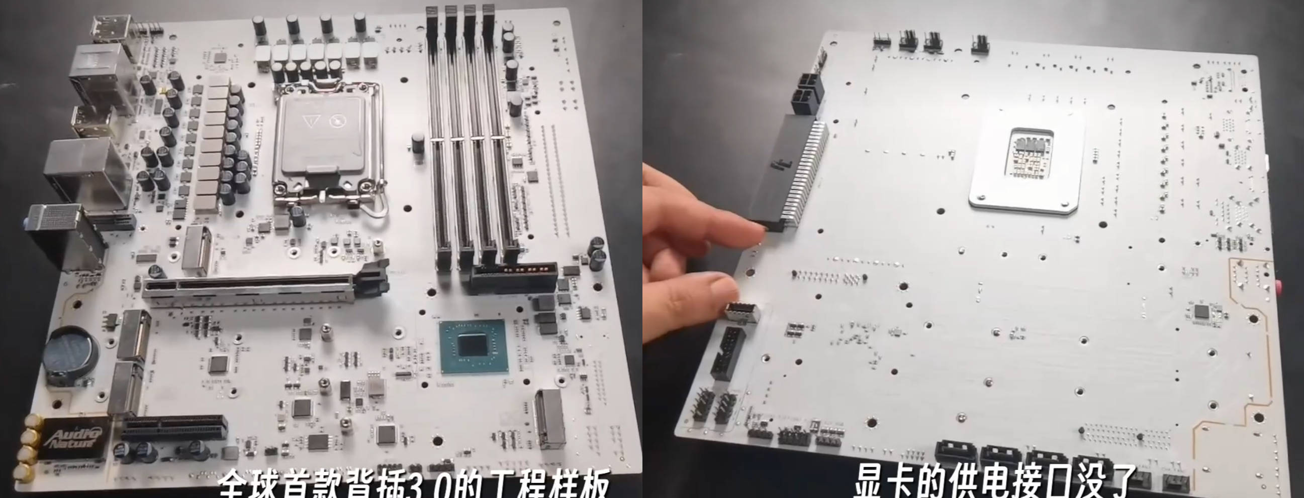 скриншот видео Bilibili Как можно видеть не примере прототипа системной платы, эта самая плата имеет один большой 50-контактный разъём питания. Он обеспечивает энергией саму плату, процессор и видеокарту. Да, кабель от блока питания к видеокарте тянуть не придётся. Правда, подключить таким образом получится только 3D-карты с разъёмом GC-HPWR на основе PCIe. Такие карты уже есть на рынке, но пока что их крайне мало и выпускает их фактически только Asus.