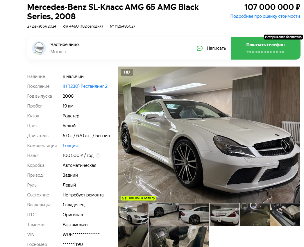 На Авто.ру появился уникальный суперкар Mercedes-Benz SL 65 AMG Black Series. Автомобиль 2008 года выпуска всё это время принадлежал одному владельцу и практически не использовался — его пробег составляет всего 19 километров. Купе оценили в 107 миллионов рублей, что делает его одним из самых дорогих предложений на российском рынке.