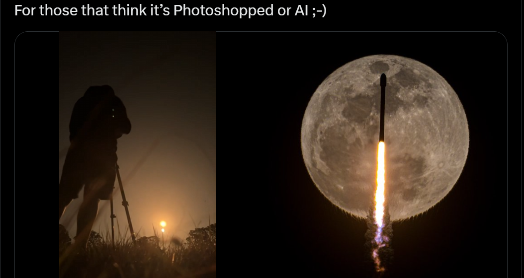 Снимок Джона Крауса, на котором Falcon 9 пролетает на фоне Луны, вызвал обсуждения в сети: некоторые пользователи предположили, что изображение создано с помощью фотошопа или искусственного интеллекта. Фотограф опроверг эти домыслы, опубликовав дополнительные кадры, демонстрирующие процесс съемки.