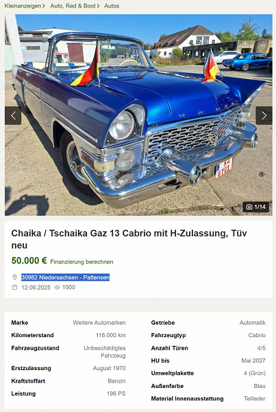В Германии в городе Паттензен земли Нижняя Саксония на продажу выставили уникальную «Чайку» ГАЗ-13. Как сказано в объявлении, машина принадлежала бывшему президенту Болгарии.