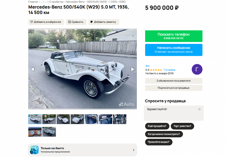 На площадке «Авито Авто» появился по-настоящему уникальный лот — Mercedes-Benz 500K 1936 года. Родстер, собранный вручную на заводе в Зиндельфингене, продаётся за 5,9 млн рублей. Всего было выпущено 342 экземпляра, и каждый из них имел индивидуальную сборку, включая выбор цвета кузова, интерьера и комплектации.