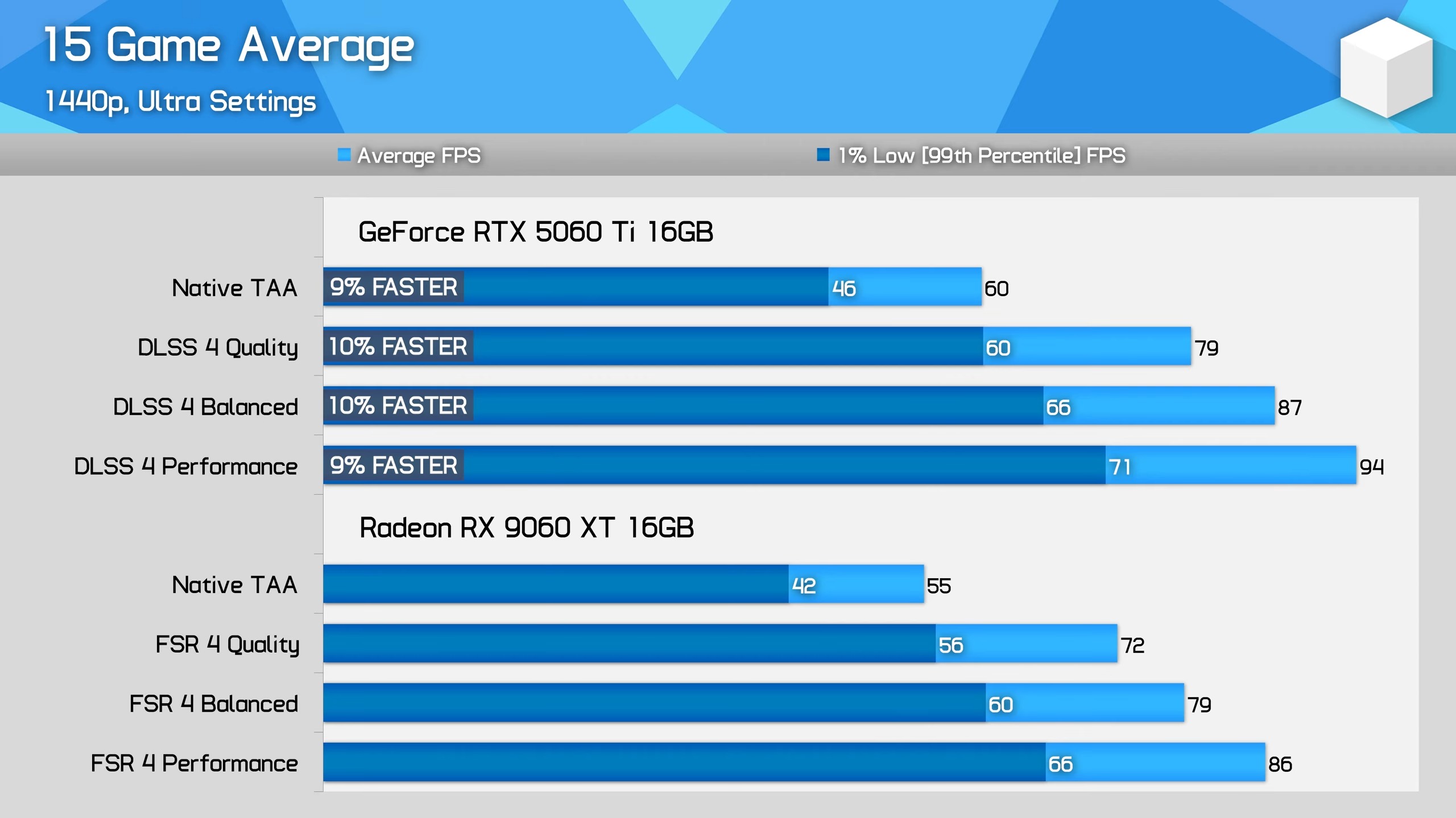 Большинство геймеров всё равно пользуется апскейлерами. Появилось сравнение RTX 5060 Ti 16GB и RX 9060 XT 16GB с использованием DLSS 4 и FSR 4