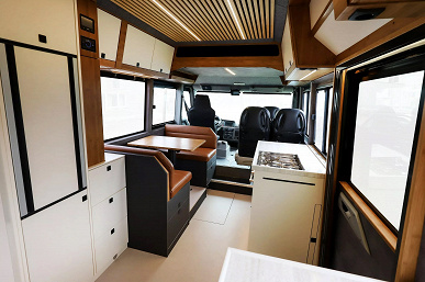 Фото: Daemmler За сиденьями водителя и переднего пассажира расположены два дополнительных сиденья и просторная обеденная зона — с духовкой, плитой с четырьмя конфорками, большим холодильником, раковиной. В задней части находятся две односпальные кровати, которые можно трансформировать в двуспальную. Также имеется небольшая ванная комната с душем и туалетом.