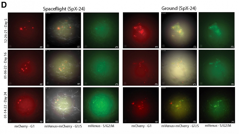 Снимки клеток с миссии SpX-24: в течение 34 дней клетки были на орбите, а общее время их культивирования в реакторе — 42 дня. Изображения получали в одном и том же месте реактора, чтобы наблюдать, как клетки проходят через разные стадии развития. Источник: Pham, Jessica et al. Для проведения исследования был разработан новый нанобиореактор — миниатюрная биосенсорная система, позволяющая культивировать человеческие стволовые клетки в космосе и отслеживать их с помощью инструментов обработки изображений на основе ИИ.