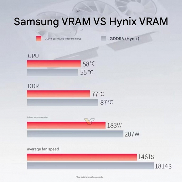 Фото Videocardz Но и это не всё. Вся эта разница получена при том, что вентилятор на версии с памятью Hynix крутился быстрее: 1814 об/мин против 1461.