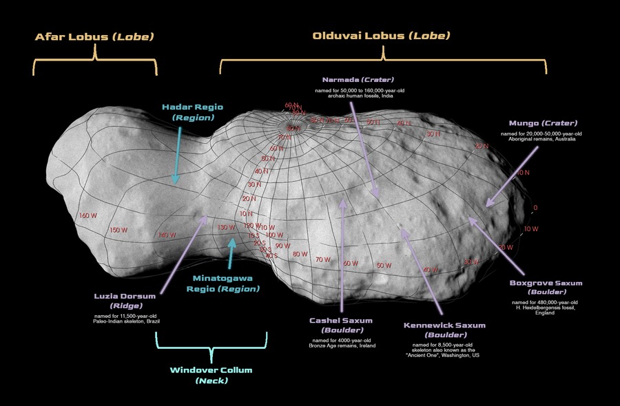 Источник: NASA Goddard / SwRI / Johns Hopkins APL Меньшая доля астероида названа Afar Lobus (доля Афар), в честь эфиопского региона, где были найдены останки «Люси» и других гомининов. Большая доля получила название Olduvai Lobus (доля Олдувай), по названию ущелья в Танзании, которое также подарило множество важных открытий, связанных с гомининами.