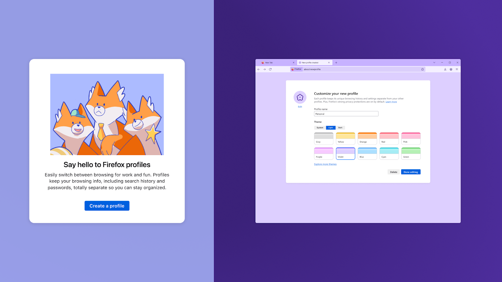 Каждый профиль Firefox хранит данные о просмотре отдельно. Каждый профиль можно настраивать, назначая индивидуальные аватары, цвета и темы. Это похоже на использование нескольких профилей в Google Chrome, только с расширенными функциями конфиденциальности и без необходимости создавать несколько учётных записей с отдельными адресами электронной почты.