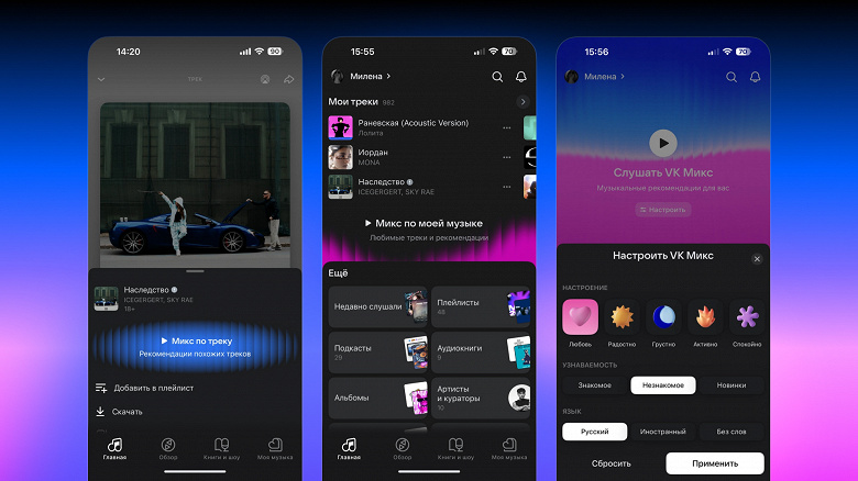 Иллюстрация: VK В разделе «Моя музыка» появилась настройка «Микс по моей музыке» — смесь треков из коллекции пользователей с добавлением рекомендаций. Также в «VK Микс» появились «мультинастройки». Теперь пользователь может одновременно выбрать несколько характеристик для настройки рекомендаций, например «Радостно», «Новинки» и музыка без слов.