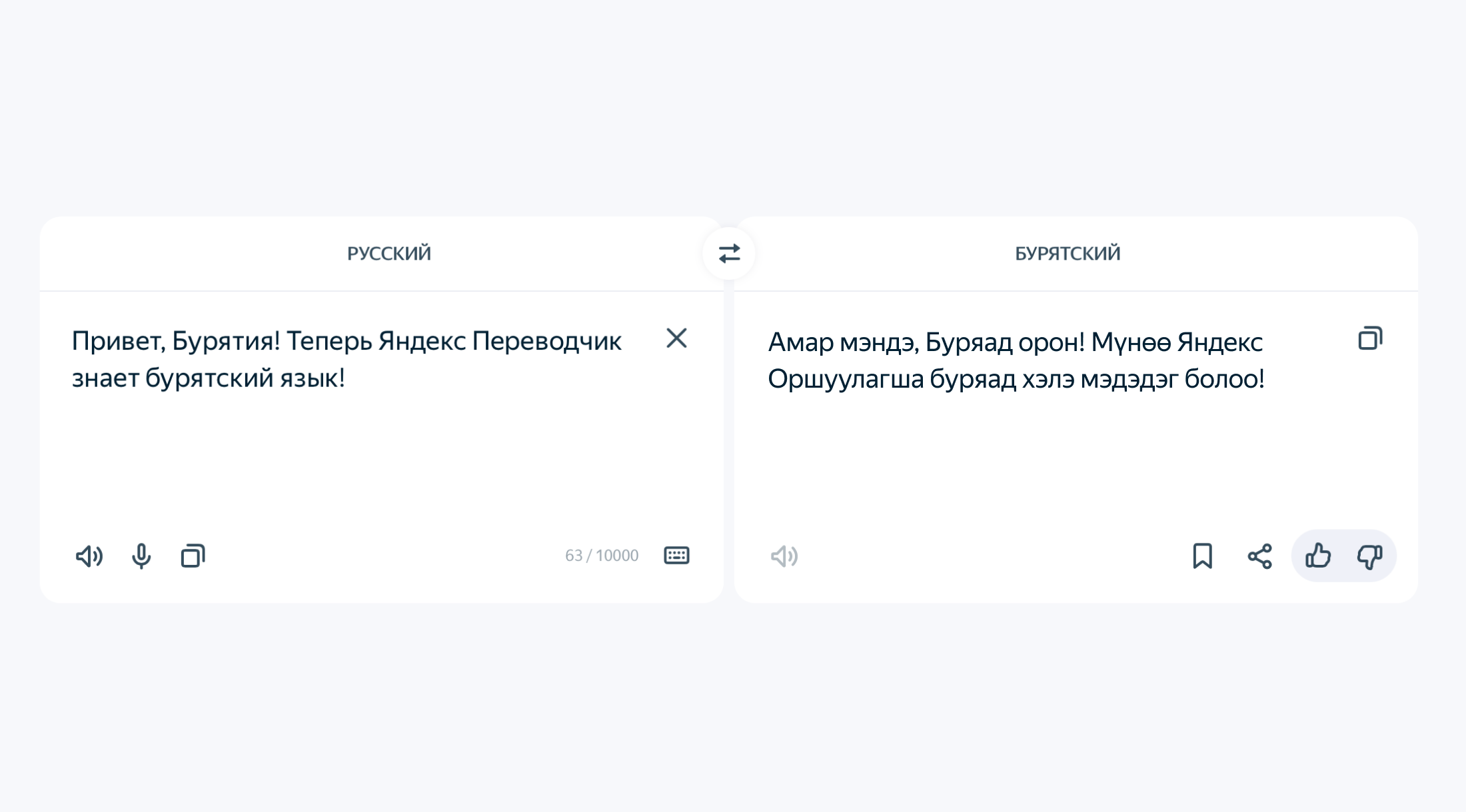 Иллюстрация: Яндекс Яндекс развивает проект по сохранению языков народов РФ совместно с Домом народов России при поддержке Федерального агентства по делам национальностей. На старте проекта в «Переводчике» было доступно 7 языков, сейчас их уже 15. Помимо бурятского, это татарский, башкирский, марийский, горномарийский, удмуртский, чувашский, якутский, тувинский, осетинский, коми, эрзянский, мокшанский, карачаево-балкарский и кабардино-черкесский.