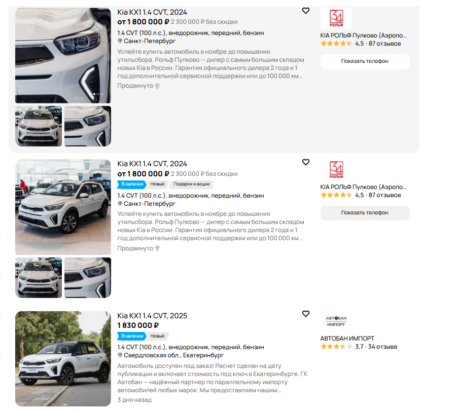 Фото Kia Крупный дилерский «Kia Рольф» продаёт такие машины с автосалонами в Москве и Санкт-Петербурге по цене от 1,8 млн рублей, при этом предлагает на них собственную гарантию 100 000 км пробега или 2 года плюс дополнительный год сервисного обслуживания.