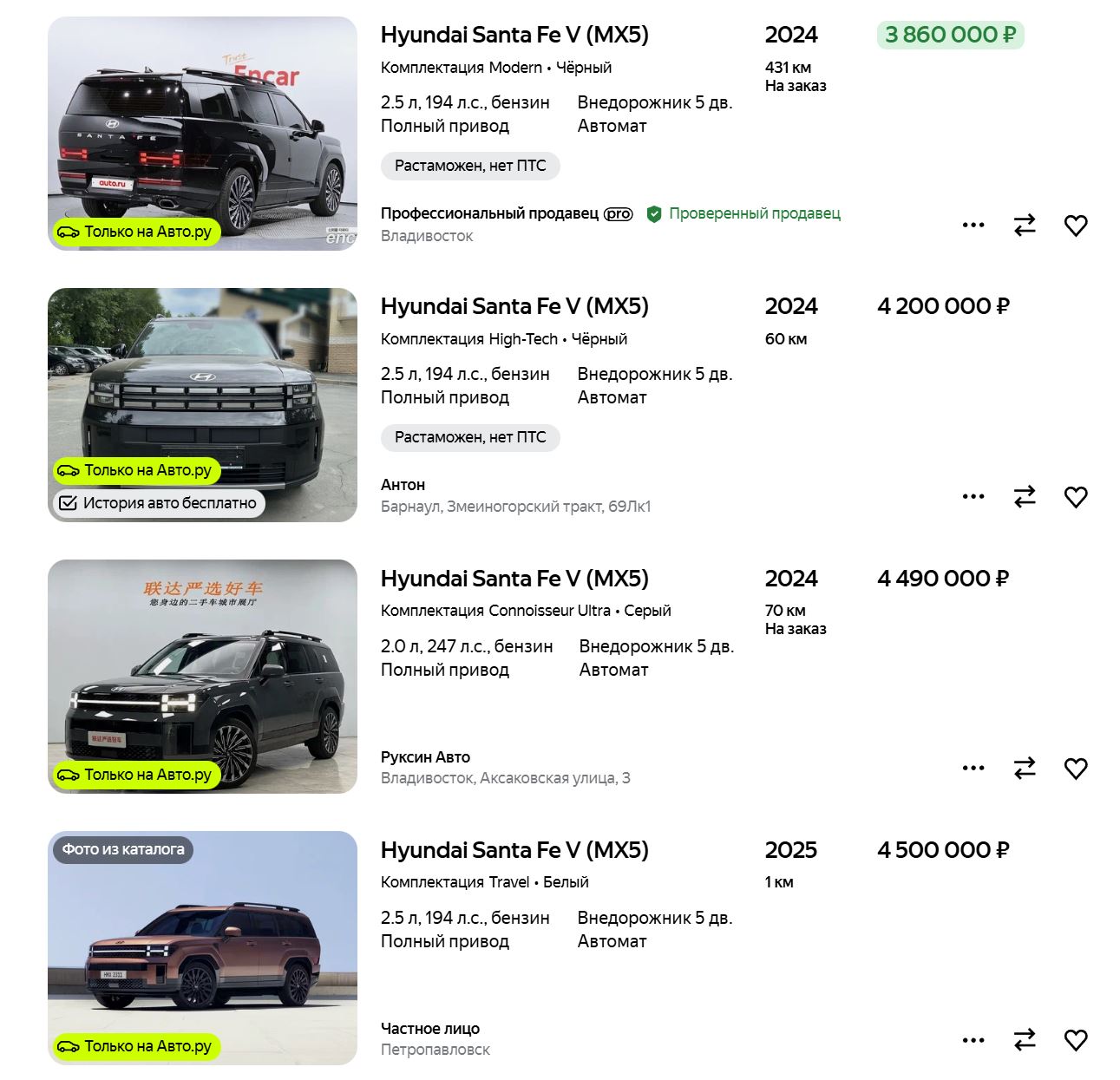 Фото: Hyundai Столько компания из Владивостока просит за машину с 2,5-литровым атмосферным мотором мощностью 194 л.с., полным приводом и 8-ступенчатым «автоматом» в небедной комплектации с кожаным салоном, панорамной крышей, проекционным экраном и полным «зимним пакетом».